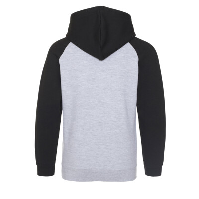 Charcoal 52% ringspun cotton/48% polyester. Soft cotton faced fabric. Brushed back fleece. Contrast raglan sleeves. Contrast double fabric hood with flat lace drawcord. Front pouch pocket. Ribbed cuffs and hem. Twin needle stitching. Tear out label.