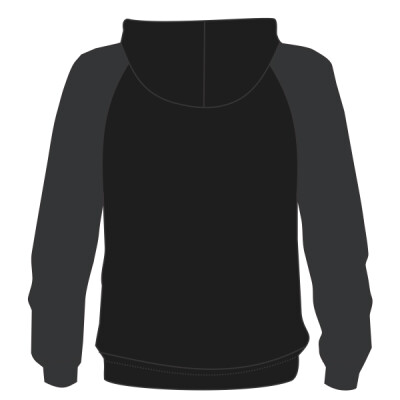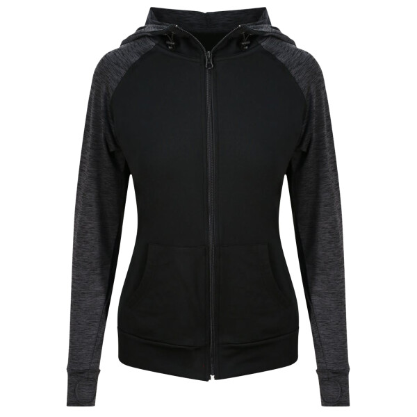 Feminine fit sports zoodie with adjustable drawcords hood, raglan sleeves with thumb holes and full-front zip. Contrast fabric on sleeves and body.