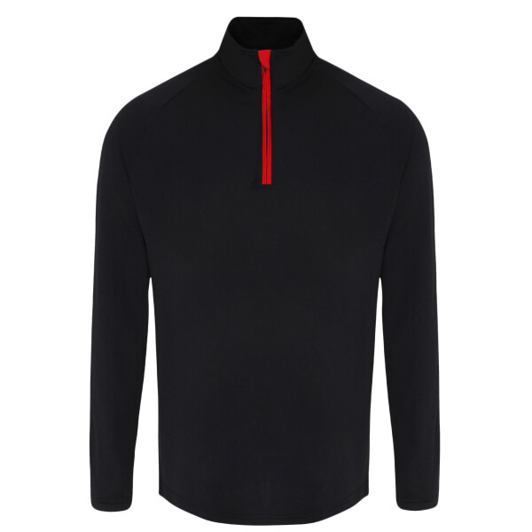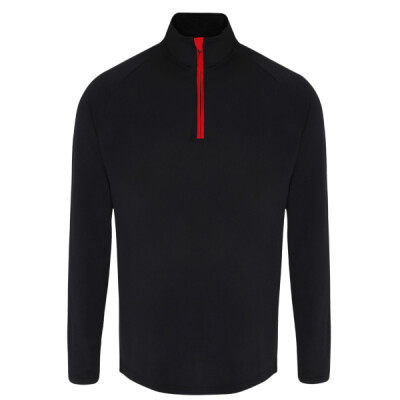 Contrast ¼ zip. Long sleeves. Stretch. Twin-needle stitching. Wicking fabric. We recommend using block out vinyl and inks.Product contains no branded neck or waist label. Removable Kimble or looped garment tags. Inner seam label holds important product information on one label with a second label containing brand information which can be cut-away. UPF 40+.