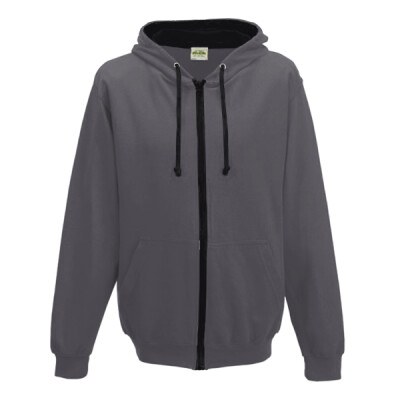 Charcoal 52% ringspun cotton/48% polyester. Soft cotton faced fabric. Brushed back fleece. Double fabric hood with contrast inner. Contrast flat lace drawcord. Full length contrast plastic zip. Front pouch pockets. Ribbed cuffs and hem. Twin needle stitching. Tear out label.