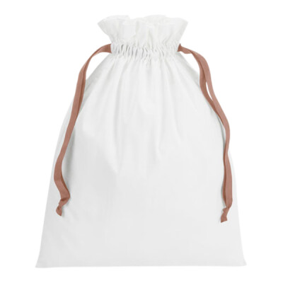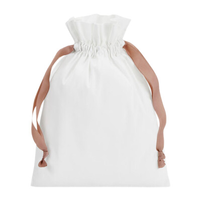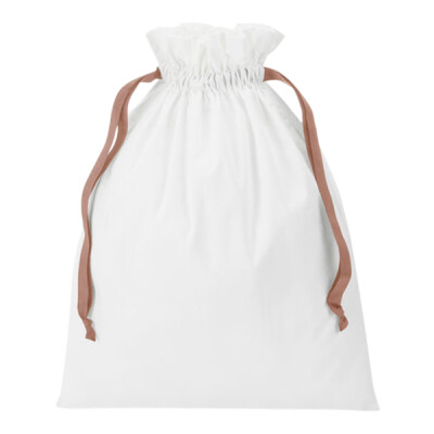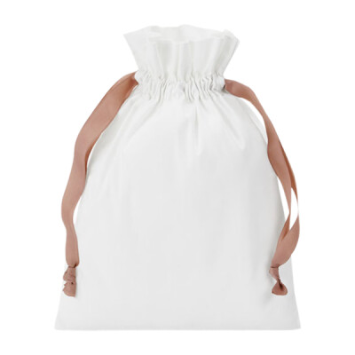 100% Brushed cotton, 140gsm (4.1oz/yd²). Perfect for seasonal gifting. Multipurpose use. Contrasting colour ribbon. Ribbon drawstring closure.TearAway label for easy rebranding.