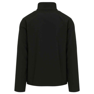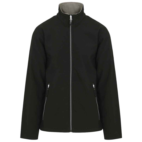 Two layer soft shell. Mechanical stretch polyester outer layer, made from at least 50% recycled fabric (in transition). Contrast warm polyester fleece backed. Showerproof and windproof. Full length zip with chin guard and inner zip guard. Two front zip pockets. Open cuffs and hem. Cut out label.