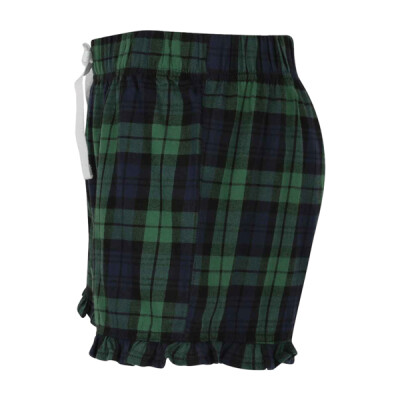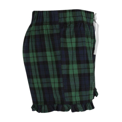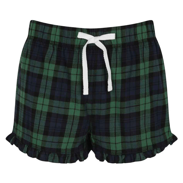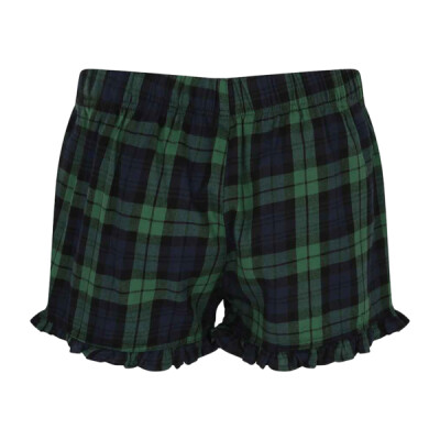 Woven tartan shorts with frill hem. Full elasticated waist with contrast mock drawcord. Tear-out label.