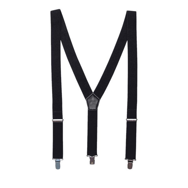 Y back trouser braces with stretchy elastic fabric for comfort and style. 3cm strap width. Two metal non slip clips to the front for attachment to trousers. One clip to the back. Metal lock buckles for adjustment making a one-size-fits-all piece.