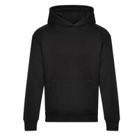 Cotton faced fabric. Brushed back fleece. Drop shoulder style. Oversized fit. Three panel double fabric hood. Front pouch pocket with inner media pocket. Ribbed cuffs and hem. Twin needle stitching. Tear out label.